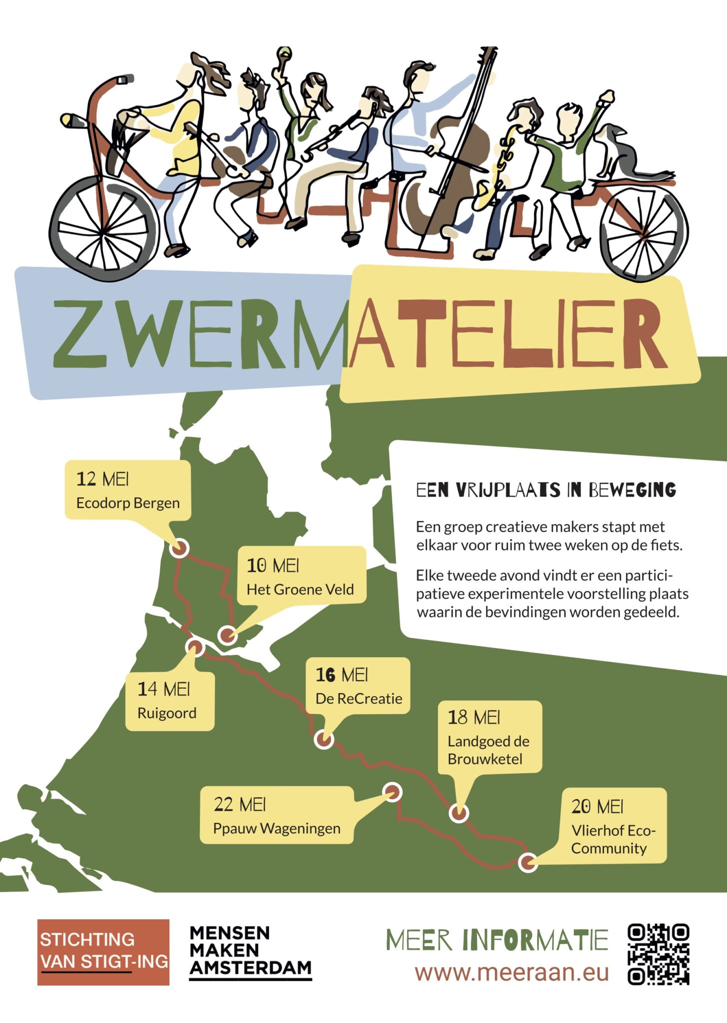 Vlierhof - BGG Seminar House Klever Str. 115, Kleve, DuitslandEen groep creatieve makers stapt op 9 mei 2026 met elkaar voor ruim twee weken op de fiets. We verblijven steeds twee nachten op een inspirerende buitenplek en reizen daarna weer verder. De tocht brengt deze mensen bij elkaar om samen ons persoonlijke belevingsonderzoek te doen. Het is aldus een bewegende broedplaats. Elke tweede avond (woensdag 20 mei op de Vlierhof) vindt er een participatieve experimentele voorstelling plaats waarin de bevindingen hiervan worden gedeeld.